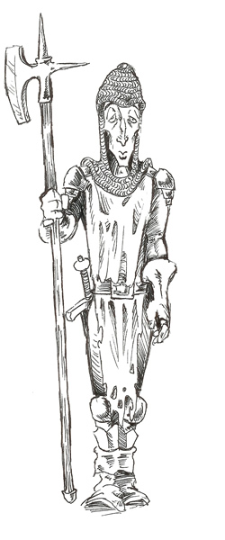 The guards, who like Taryl, the author, and perhaps the reader, were completely ignorant of the definition of the word “jaunty” either as a adjective or an adverb, nevertheless recognized a threat when they heard it. The taller guard, against all expectation, paused in his mastication and took a sudden interest in the drama unfolding before him, while the shorter hefted the stout pike in his meaty fist, as if testing it for its own jauntiness. As stated before, Taryl’s was a quick wit, and his bright eye had soon taken the measurement of the pike, multiplied it by two, then compared it with the well-known length of his own jaunty longsword. The product of this mathematical exercise caused that noble brow to furrow in some concern; then a conclusion was no doubt reached, for our dear lord turned on his noble heel and sprinted back up along the road from whence he’d come. Borin found himself motivated to follow his master primarily by loyalty, and perhaps also by the manner in which the guards continued to heft their pikes, yet now turned their attention to the innocent lackey.